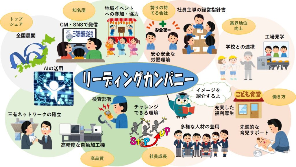 リーディングカンパニーとはその業界を代表する会社であり、けん引できる会社だと考え、以下の4つの観点を意識して目指していきます。